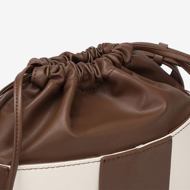 The textured rope handle and drawstring are fastened by metallic hardware. Fitted with crossbody functionality to go handsfree, its construction also allows it to sit upright on it’s own while holding your contents in place.